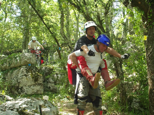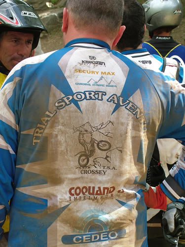 Bon j'avoue ,tout est faux, ma photo est celle d'un concurrent du trial de St Michel de Maurienne. Son club s'est défoncé pour pouvoir offrir a chacun de ses pilotes un beau maillot au couleur de Trial Sport Aventure et voilà le résultat ,on se roule dans la terre pour faire rire les copains, et que le Monsieur en question ne nie pas , je l'ai vu de mes propres yeux dans la zones 11 ,effectuer un back flip a raz la terre (c'est original et très salissant) juste devant la ligne fictive de sortie de zone et réclamer un zéro prétextant que l'axe de la roue avait passé la ligne ….,je ne sais pas ce que lui a mis le commissaire sur sa cravate , mais tout le monde était mort de rire