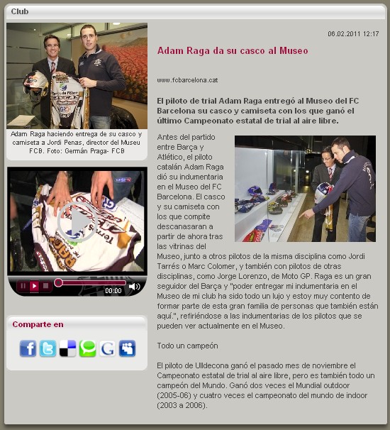 Adam Raga est un fan de foot et fan du FC Barcelone, aussi il a été invité comme auparavant deux autres grands trialistes supporter de la mythique équipe Catalane (Jordi Tarres et Marc Colomer) a mettre sous vitrine du musée du club une de ses combinaisons et son casque. Une façon d'afficher son attachement au club.