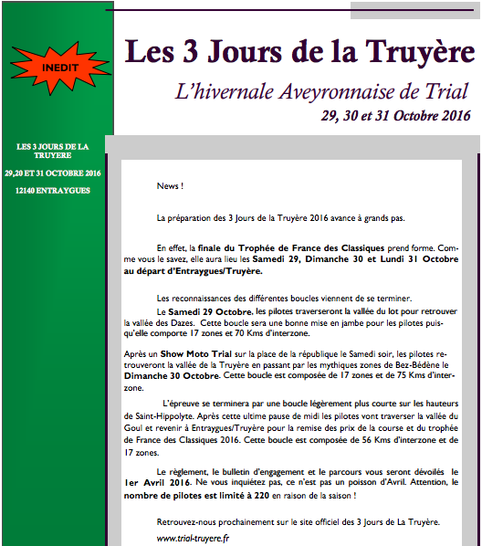 Les 3 Jours du Cantal n'auront pas lieu en 2016, c'est pourquoi le Trial Club de Saint Mamet a décidé d'organiser les 3 Jours de la Truyère au départ d'Entraygues/Truyère.