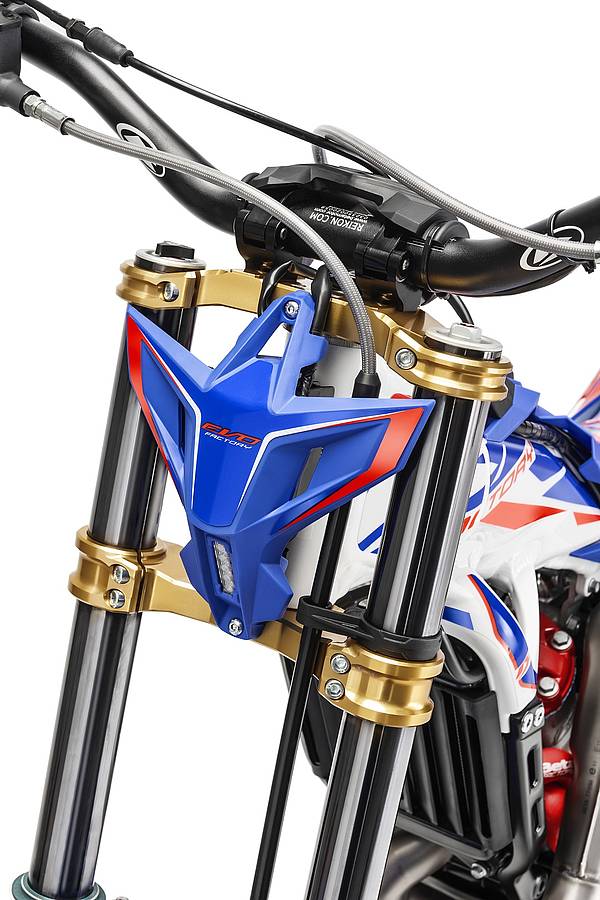 L'expérience développée lors des compétitions mondiales les plus importantes nous a permis d'affiner davantage les performances de la Factory, créant un véhicule avec une âme purement racing. Le département R&D, travaillant en étroite collaboration avec le Beta Factory Team et les coureurs Matteo Grattarola, nouveau champion du monde Trial2, et Benoit Bincaz, a une fois de plus pu relever la barre de l'Evo Factory en faisant des mises à jour donnant un plus grand contrôle et une réactivité de référence sur tout type d'obstacle.