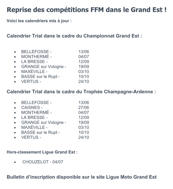 le Calendrier des trials FFM du Grand Est, merci à Dominique Holfert ( commission trial Grand Est) pour les infos