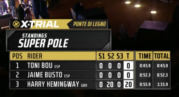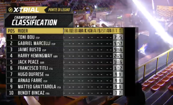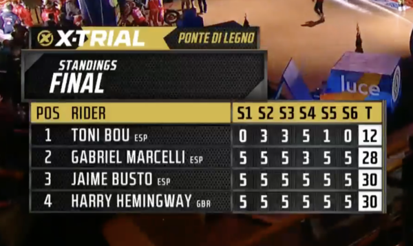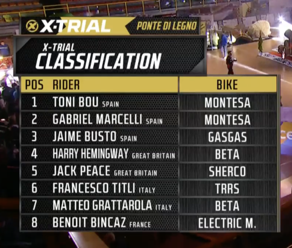 Première des deux journées de X Trial à Ponte Di Legno ( la seconde ce soir à 20 heures) et sur un parcours très difficile Toni Bou a facilement fait la différence sur ses concurrents . Deuxième place pour Gabriel Marcelli et bataille entre Harry Hemingway et Jaime Busto pour la troisième place remporté sur une épreuve supplémentaire pour les départager au profit du pilote GasGas ... vidéo