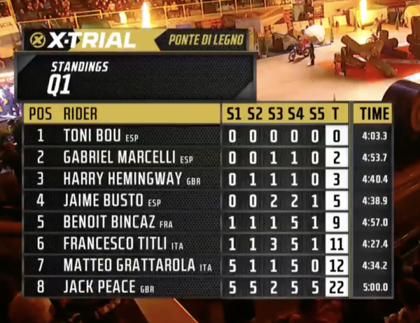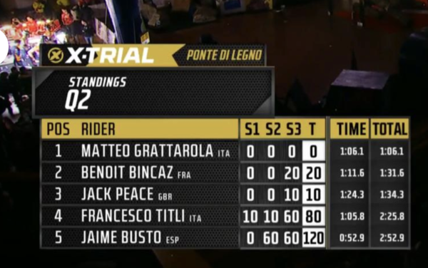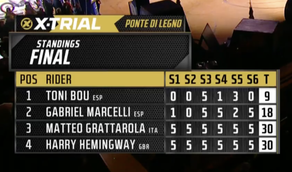 Deuxième journée en Italie pour le X Trial de Ponte Di Legno et un même vainqueur , Toni en démonstration devant Gabriel Marcelli accrocheur et un Matéo Grattarolla si heureux de ce podium à domicile . On retiendra la nouvelle qualification en finale dès le premier tour du jeune Harry Hemingway décidément impressionnant mais qui a eu du mal a gérer la fin de course . On a été aussi très heureux du retour en forme de Benoit Bincaz qui rate la finale d'un rien (2ème place en en Q2)