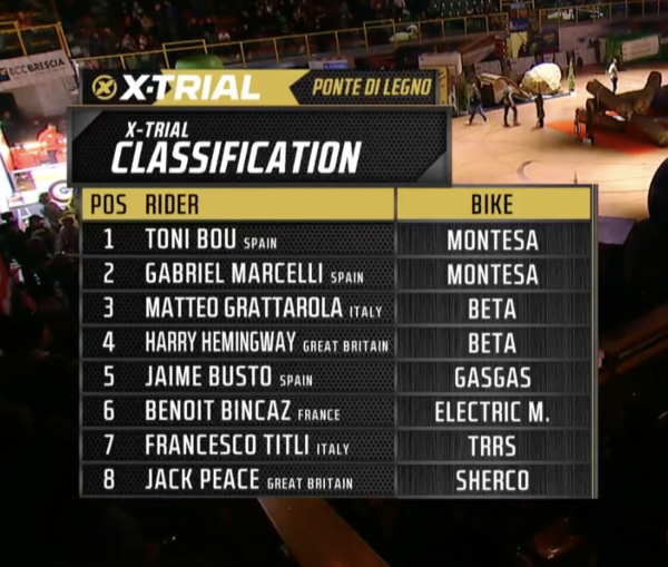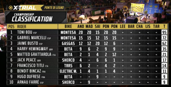 Toni Bou (Repsol Honda Trial Team) a conclu la première moitié du Championnat du Monde FIM X-Trial ce soir en signant sa deuxième victoire à Ponte di Legno. Plus en difficulté qu’hier, il n’a pris l’avantage sur son coéquipier Gabriel Marcelli que dans les trois dernières sections de la Finale, les deux pilotes n’étant séparés que par un seul point à ce moment-là.