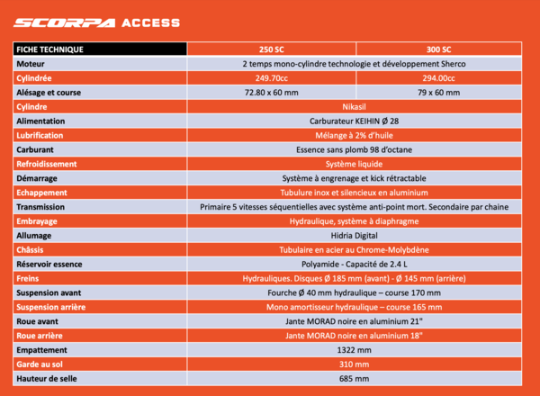 Au même titre que la Sherco Access ,chic et pas chère , la nouvelle Scorpa Access devrait séduire une large clientèle , mais dépêchez vous c'est une série limitée ... Scorpa ne nous a pas communiqué le prix mais devrait s'aligner sur sa soeur jumelle (la Sherco Access 5590 Euros)