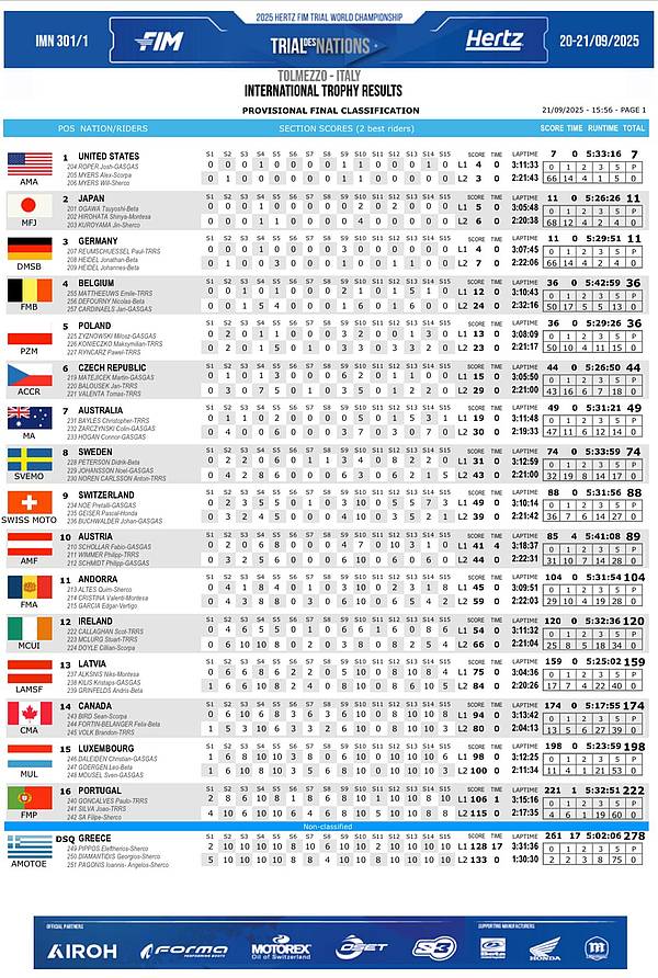 Hélas pour les Français dans la seconde zone du deuxième tour , Alexandre Ferrer a chuté et s’est blessé sévèrement à la cheville ( grosse entorse) ce qui a eu pour conséquence de le voir abandonner . Un abandon préjudiciable car le règlement est clair , en cas d’abandon tous les points au credit du dit pilote sont retirés . Un fait de course qui prive le team France d’une troisième place qui était à leur porté .