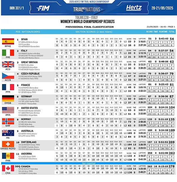 C’est sans surprise que les trois meilleurs pilotes du championnat du Monde de trial GP ( Bou, Busto, Marcelli), tous Espagnols, remportent cette édition 2025 du Trial des Nations , une compétition par équipe de 3 ou dans chaque zone les deux meilleurs résultats sont retenus . L’intérêt de cette compétition depuis une vingtaine d’année réside désormais chez les hommes a savoir qui saura sur le podium derrière nos voisins Ibères.