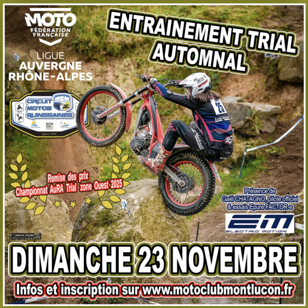 - Remise des prix du Championnat AuRA Trial zone Ouest 2025 à 12h00 & cocktail offert (organisé par la commission Trial ligue Moto AuRA).