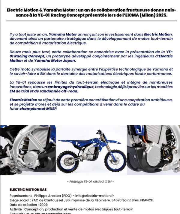 Cette incroyable collaboration d’EM avec Yamaha pour une moto de cross ( et certainement plus tard d’enduro) assure en effet la pérennité et le développement d'un secteur ( le trial électrique ) en montrant le savoir faire de la marque Française désormais « motoriste » de Yamaha pour ses produits tout terrain .