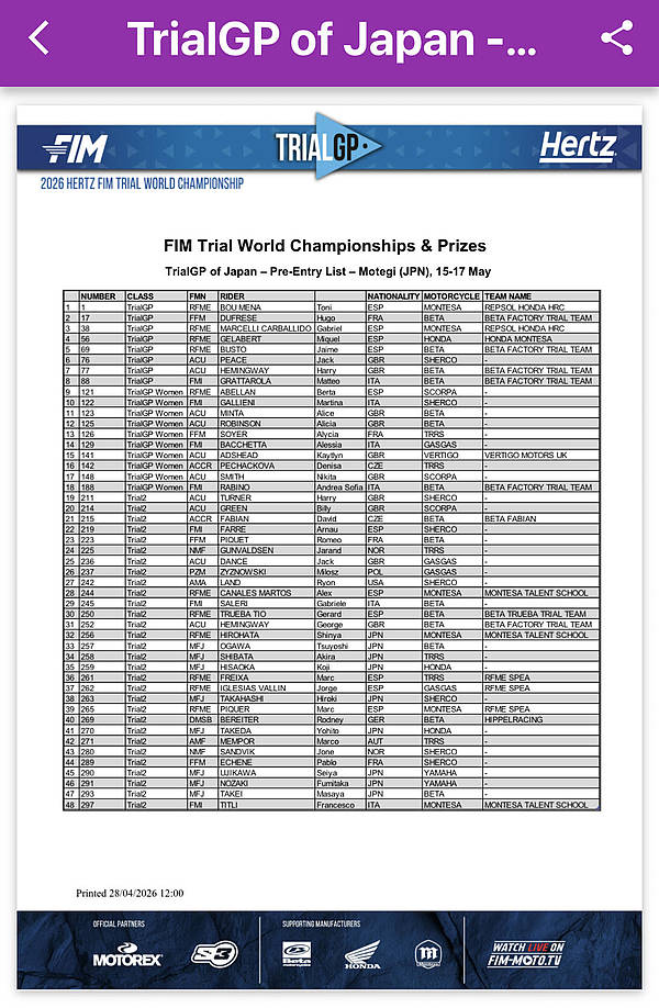 La manche d'ouverture du championnat du Monde de trial , ce sera les 15 et 16 mai à Montegi (Japon). On connait désormais la liste des engagés. Ils seront seulement 8 pilotes en catégorie reine ( Trial GP) avec un événement historique , la participation d'une moto électrique pour la première fois dans l'histoire du trial dans cette catégorie . Ce sera Miquel Gelabert sur la Honda électrique qui aura l'honneur d'ouvrir cette page de l'histoire du trial .