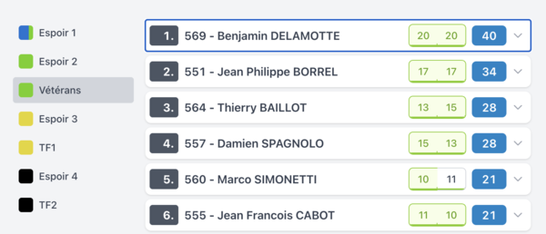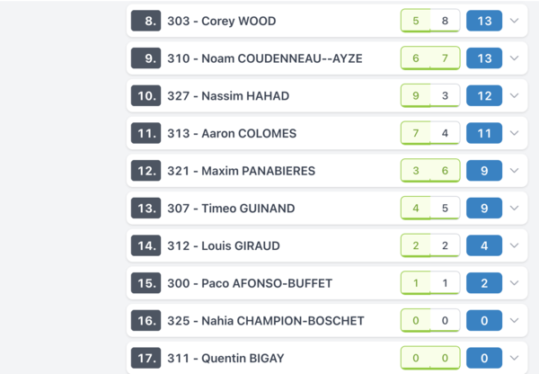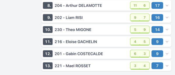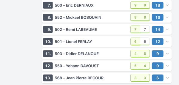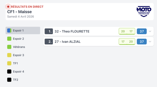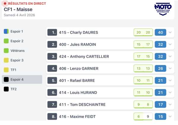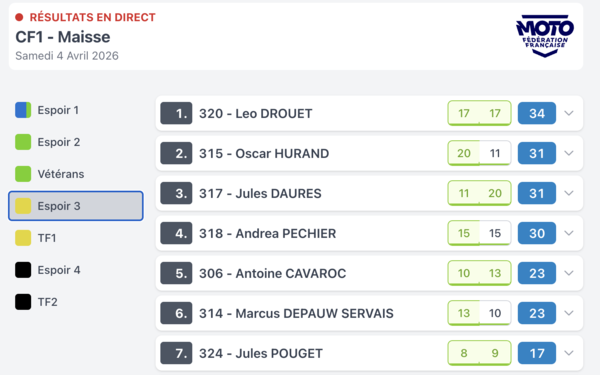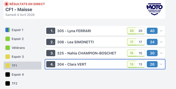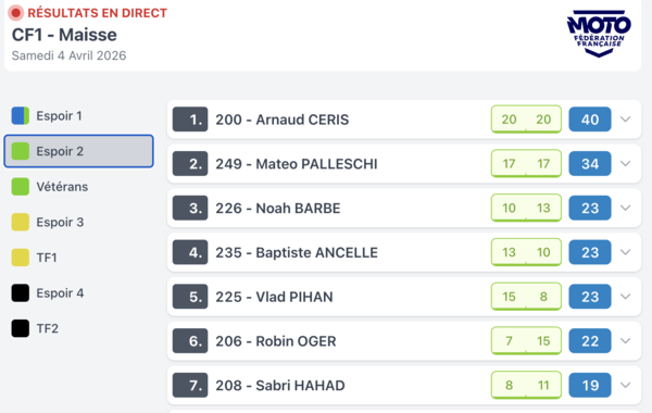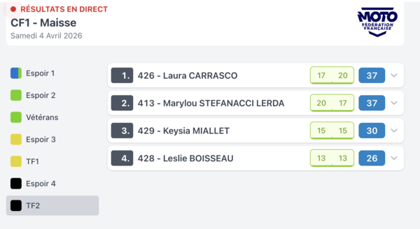 Voilà les résultats de la manche d'ouverture ce samedi à Maisse pour ces catégories . Pour bien comprendre ce tableau les points sont les pointas attribués attribués en fonction de la position finale (ex 20 points = 1er)