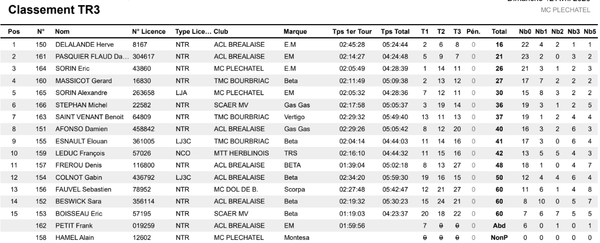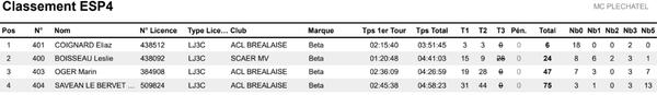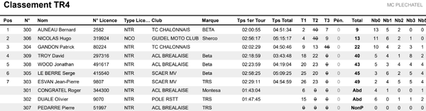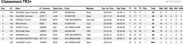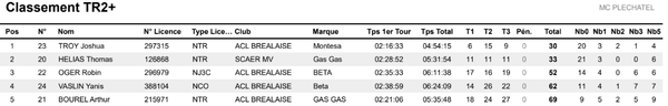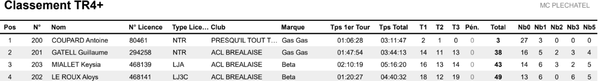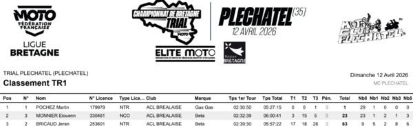Dimanche dernier, le MC Pléchatel (35) a organisé l'ouverture du championnat de Bretagne. Le président Michel Tourneur et son équipe nous ont concocté un bel interzone et des zones modifiées qui ont ravi les participants. Merci aux bénévoles et aux commissaires. Les zones sélectives et les quelques averses de pluie ont permis de départager les pilotes. Les hiérarchies ont été confirmées avec les victoires notamment en TR1 de Martin POCHEZ, en Tr2+ Joshua TROY, en TR2 de Arthur CAMPION (leader du france en Tr3+), en TR3+ de JF Dalidec talonné par son fils Germain Dalidec. A noter également un podium pour Keysia Tr4+ et Leslie en TR4. Et en TR3, un podium 100% EM.