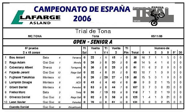 Magnifique bagarre que se sont livrés ce Dimanche Toni Bou et Adam Raga ,pour la finale du championnat d'Espagne, sur des zones très sélectives ,le pilote Beta a remporté le premier tour, pas être de quoi être complètement libéré quant on a à ses basques le champion du Monde, Adam Raga a 4 points de retard mais l’habitude de très bien finir ses deuxième tours. Adam améliorera effectivement son deuxième tour de 5 points, mais ce diable de Toni Bou ,frappe un énorme coup en améliorant son score du premier tour de 7 points. Derrière , Cabestany, Fajardo et Fujinami se disputent la troisième place et c’est dans cet ordre qu’ils se classeront. A noter que si le score de Fujinami 88 points semble énorme c’est qu’il a pris 35 points de pénalité de temps, qui l’aurait placé sur la troisième place du podium s’il ne les avait pas concédé. Par contre pour Doug Lampkin (89 points) cette épreuve a été un véritable calvaire , le pilote Britannique doit se poser au lendemain de cette épreuve beaucoup de questions quant à la fin de sa carrière, pire encore , Marc Freixa 118 points battu par Daniel Gibert 107 points.