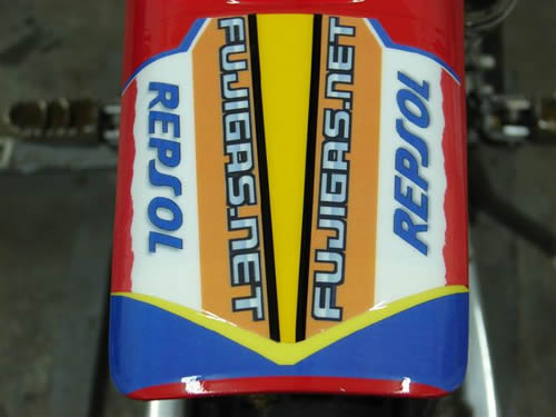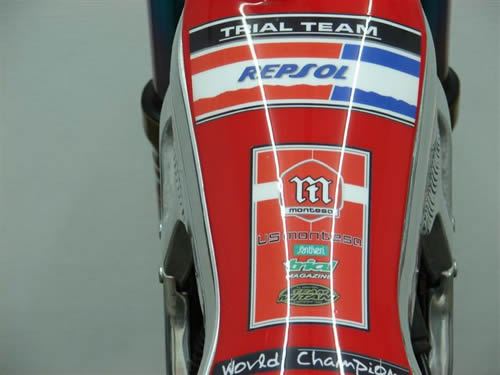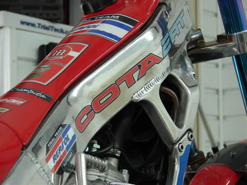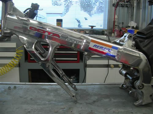 J AI POLI LE CADRE AINSI QUE LES SUPPORTS DE FOURCHE REFAIT LES DÉCALCOMANIES AUX COULEURS REPSOL ET J AI APPELLE LA MOTO COTA 2 RT POUR COTA 2 TEMPS RACING TRIAL "