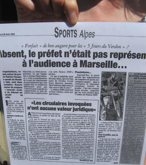 Le litige avec la prefecture des Alpes de hautes Provences était lié avec la circulaire Olin du 6 septembre 2005 qui imposait une étude d'incidence en cas de traversé des zones Natura 2000 .