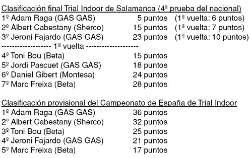 La quatrième des neuf épreuves que compte le championnat d’Espagne de trial Indoor Espagnol a vu ce week end la victoire d’Adam Raga qui conforte sa première place au classement général de ce championnat. Albert Cabestany monte sur la deuxième marche du podium. Pour la troisième place déception pour Toni Bou qui ne se qualifie pas pour la finale et cela pour le plus grand plaisir de Jeroni Fajardo