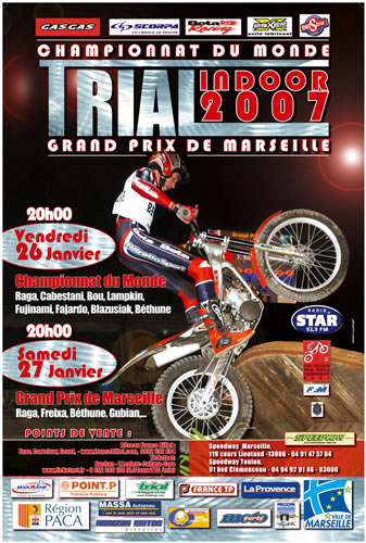 Marseille , c’est Vendredi 26 janvier pour la manche Française du championnat du Monde ,et c’est Samedi pour le GP de la ville de Marseille (Plateau du Samedi 27 janvier 2007 : Adam Raga, Jeroni Fajardo, Toni Bou, Jérome Béthune, Laurent Morell, Loris Gubian)… mais tout est sur l’affiche