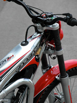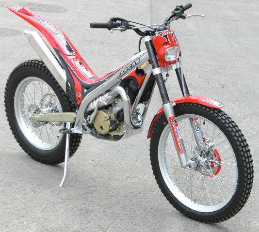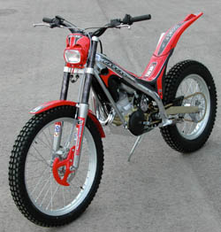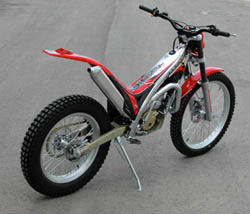 Un tout cas c'est pas un simple changement d'autocollant qu'a fait l'usine mais bel et bien une bête de course .La moto est encore un peu plus légère avec pour cela des carter et culasse en magnesium , le carbu est un Keihin , l'allumage est un Ducati , amortisseur Ohlins , les pinces de frein avant sont des nouvelles pinces Ajp . La belle est dotée d'un guidon a diamètre variable . Le silencieux final est plus long . Bien sur la déco est spécifique et la belle est dédicacée par Adam. La cylindrée est une … 300cc ! quand je vous dis que cela doit être une bête de course.