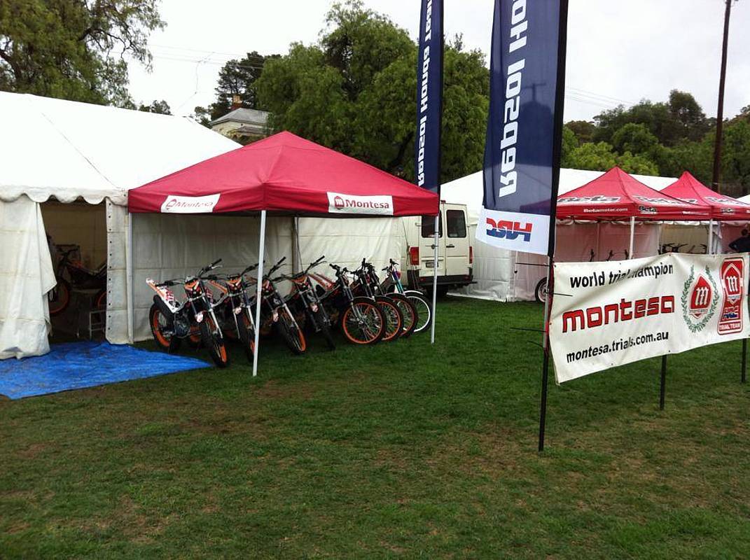 Le Paddock de la première épreuve du championnat du Monde de trial à Meldon (Australie) commence à prendre forme. Bien sur les gros camions que vous avez l’habitude de voir sur les manches « Européenne » sont absents pour des raisons évidentes et c’est sous des tentes que tout les teams se retrouvent.