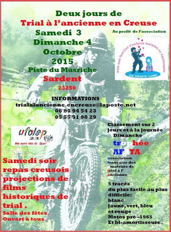 Après FRANCUEIL(37), rendez-vous en CREUSE les 3 et 4 octobre 2015 pour 2 jours de Trial à l'Ancienne. Le dimanche sera la 2ème manche du trophée AFATA 2015/2016.