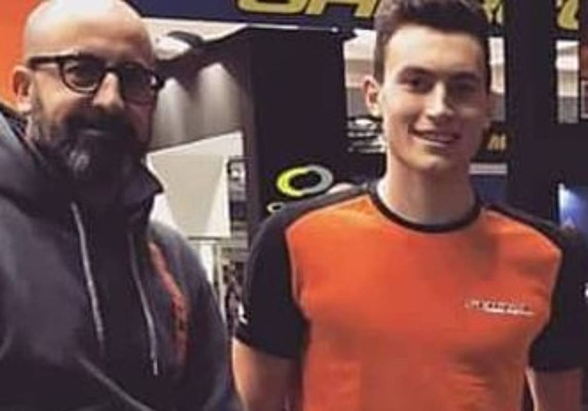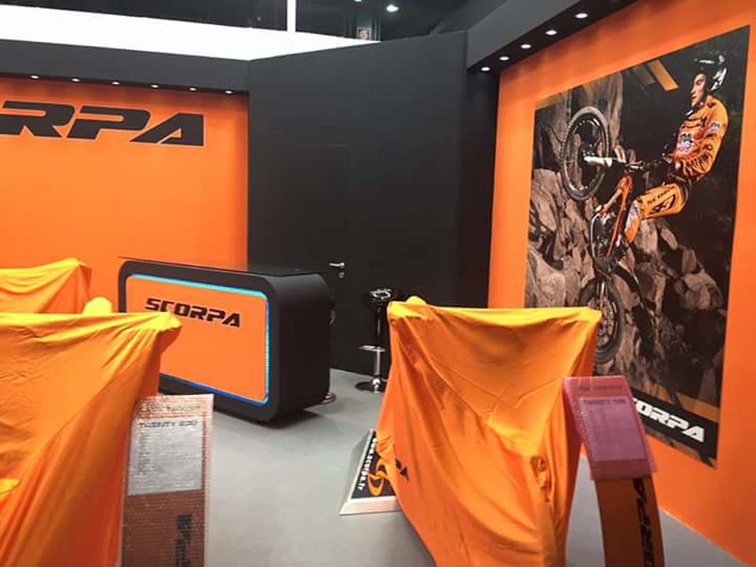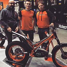 Sur le stand Scorpa, au salon de Milan, Benoit Bincaz était la vedette, un seul et unique poster de 3 mètres par 4 représentait le pilote officiel qui a rappelons le, signé pour 3 ans. Benoit qui pose devant la Scorpa du team Italien destinée au trial indoor .