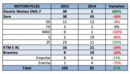 Quand une petite société Française fait mieux que le géant Autrichien et ses énormes moyens publicitaires, cela mérite bien d'être souligné ! Les résultats des ventes des véhicules électriques en France viennent de tomber et le moins que l'on puisse dire c'est que la société de Philippe Aresten peut se vanter d'avoir vendu deux fois plus de EM 5.7 que KTM n'a vendu de KTM Freeride électrique . Certes le nombre d'unités reste faible ( il s'agit des motos immatriculés, beaucoup de propriétaires d'EM n'ont pas immatriculé leur moto) , mais la progression est superbe ( + 680 %) , mais surtout le marché Français ne représente que 20 % de la production de la société Française.