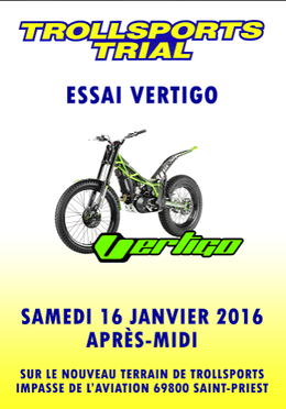 La section trial de Trollsports organise sur son nouveau terrain de Saint Priest (69) un essai de la toute nouvelle Vertigo , ce sera le samedi 16 janvier dans l'après midi, impasse de l'aviation à Saint Priest.