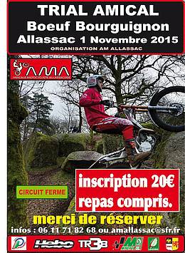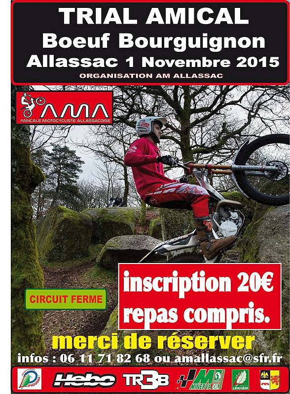 Venez rouler sur notre site de trial qui accueille régulièrement de nombreux championnats dans une ambiance conviviale. L'A.M.A vous propose une journée de TRIAL AMICAL le 1er Novembre 2015 sur des zones OPENFREE et CLASSIQUE sans commissaire. PAUSE OBLIGATOIRE le midi autour d'un repas et pour un moment de PARTAGE avec nos pilotes de débroussailleuses et nos traceurs. L'inscription pour cette journée est de 20€ avec le repas . MERCI DE RESERVER.Venez nombreux àAmicale Moto Allassac le dimanche 1er novembre 2015 . LE TRIAL EST NOTRE PASSION . l'équipe de l'AMA